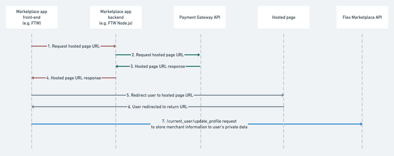 If you're using a payment gateway that provides hosted onboarding, you need to redirect the user to the onboarding page hosted by the payment provider. When the user returns from the hosted page, you receive information about the newly created merchant account (e.g., a merchant ID) in the return URL. You should store this information in the user's private data. You can use the Marketplace API's update current user endpoint for this.